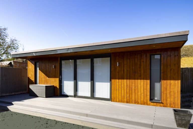 Construction of external timber garden room with office room and bathroom as well as separate shed space.